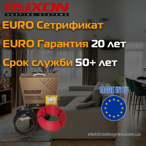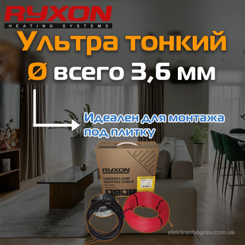 Диаметр греющего кабеля Ryxon составляет 3,6 мм, что позволяет укладывать его в минимально допустимый слой клей для плитки или другие, рекомендованные производителями растворы, адаптированные для использования в системах обогрева. Кабель не требует технического обслуживания и имеет длительный срок эксплуатации (более 50 лет) благодаря использованию высококачественных материалов.